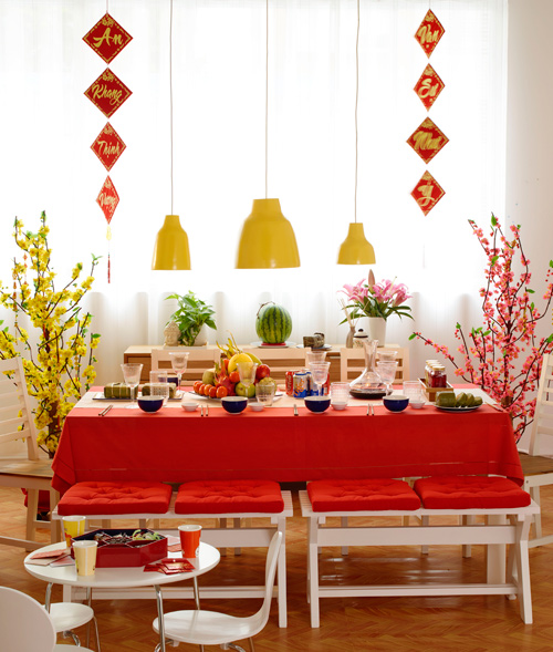 Màu đỏ không thể thiếu trong các bàn tiệc ngày Tết, bạn có thể dùng chung khăn trải bàn màu đỏ với bộ chén bát có màu trắng, với các hoạ tiết đơn giản, tránh các hoạ tiết nhiều màu rối rắm.