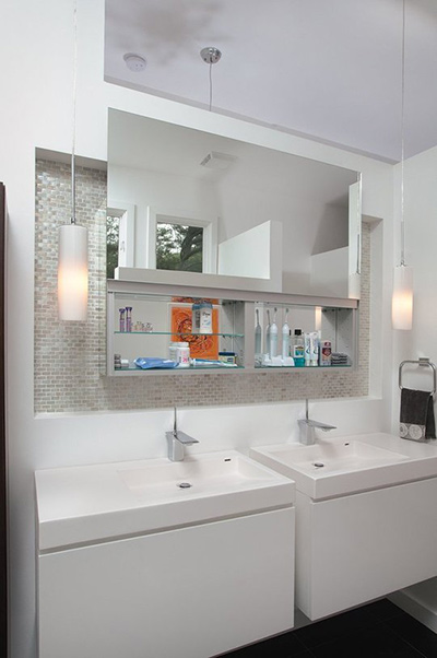 | Phía sau gương soi là những ngăn để đồ tiện lợi để được rất nhiều thứ cần thiết trong nhà tắm. |