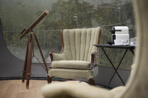 Phía bên trong quả bóng là một chiếc giường, một chiếc kính thiên văn và hai chiếc ghế. Độ trong suốt của ’bức tường’ là 180, nơi đây là địa điểm hoàn hảo để ngắm bầu trời đêm của mi