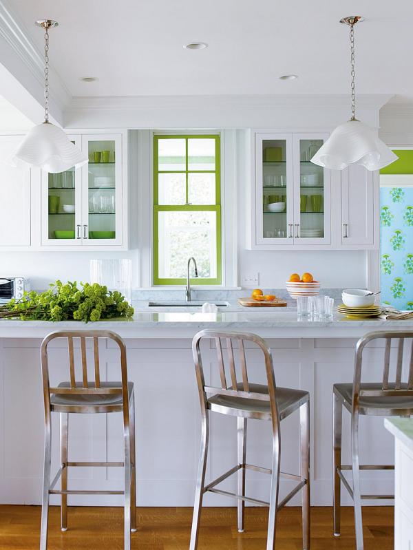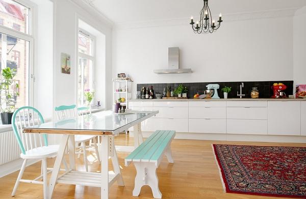 Nếu yêu thích sắc màu, yêu thích một không gian tươi vui, sinh động bạn hãy thêm sắc màu vào căn bếp đơn điệu hiện tại. Lựa chọn một số món đồ nhà bếp có thể sơn màu như ghế ngồi, bàn, khung cửa sổ… để cho căn bếp của mình một diện mạo mới nhé.