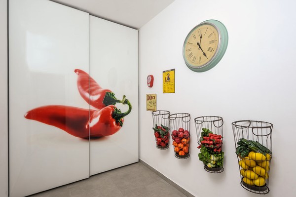 Những chiếc giỏ đựng hoa quả tươi đầy màu sắc khiến phòng bếp trông thật vui tươi.