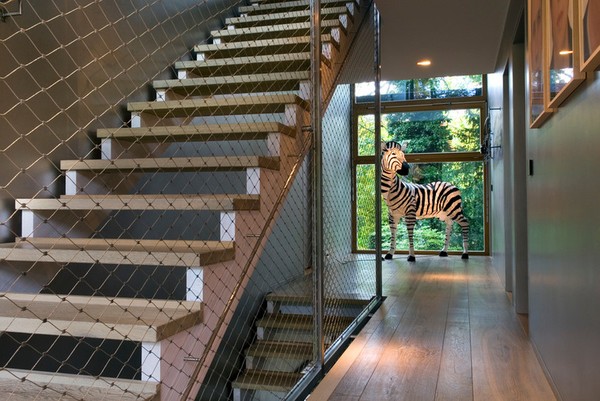 Nếu nhà bạn có con nhỏ, vậy thì ý tưởng dùng những sợi dây sắt đan thành tấm lưới chắn ở lan can hai bên giúp trẻ nhỏ không dễ bị sơ sẩy ngã xuống dưới sẽ là điều vô cùng tuyệt vời.